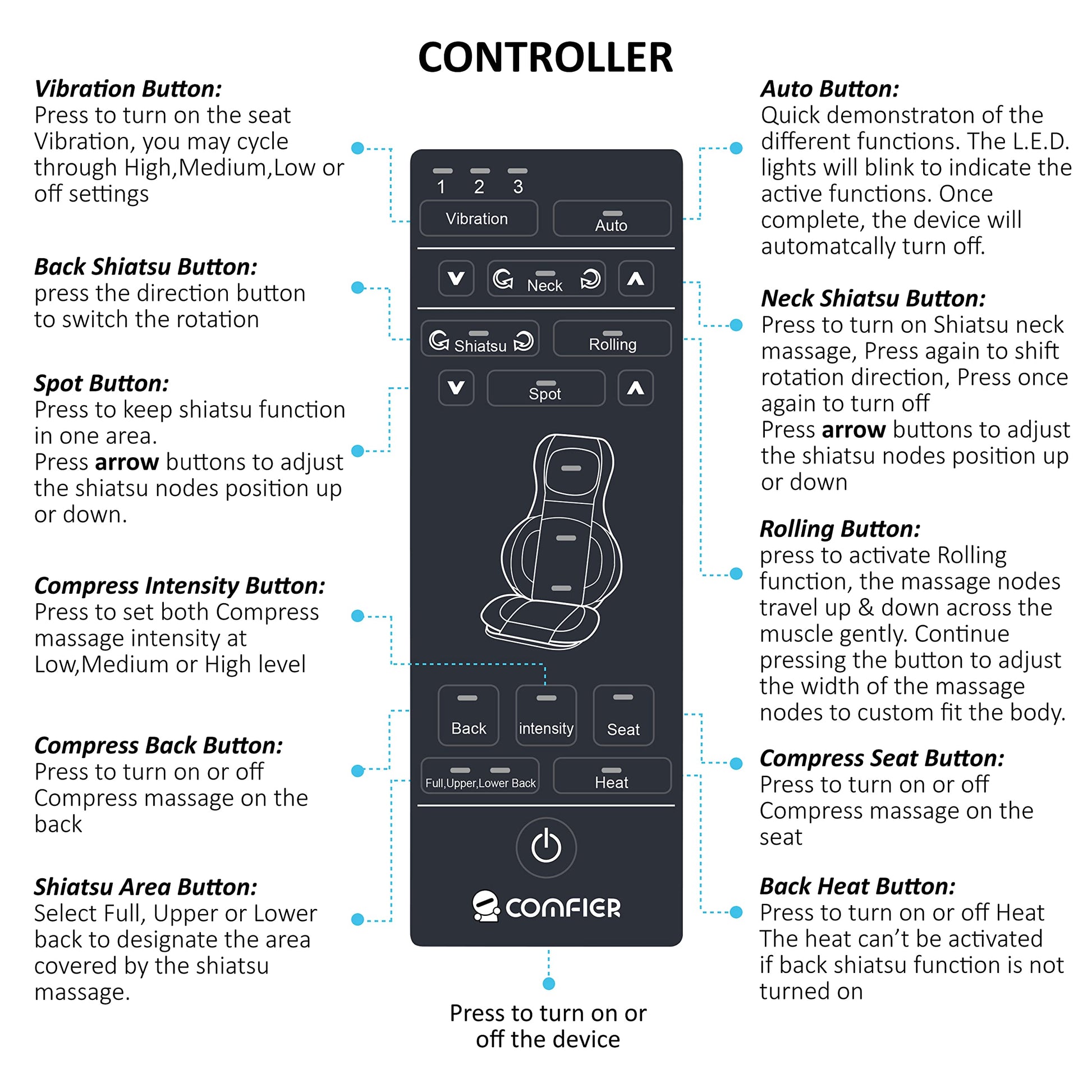 - Relajación de cuerpo completo: el masajeador de espalda Comfier combina funciones Shiatsu, amasamiento, rodamiento, compresión, amasamiento, rodamiento, vibración y calor para ayudarte a eliminar completamente la fatiga, el estrés, te proporciona una experiencia de masaje similar al spa.