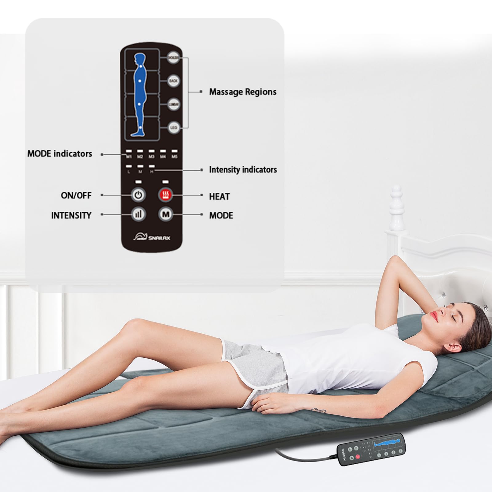 - Experiencia de masaje personalizada: alfombrilla de masaje de cuerpo completo Snailax con calor con 3 niveles de intensidad diferentes y 5 modos de masaje de vibración. Este colchón de masaje ofrece una amplia gama de combinaciones para una experiencia de masaje completamente personalizada que cumple con los requisitos específicos y la comodidad de cada usuario.